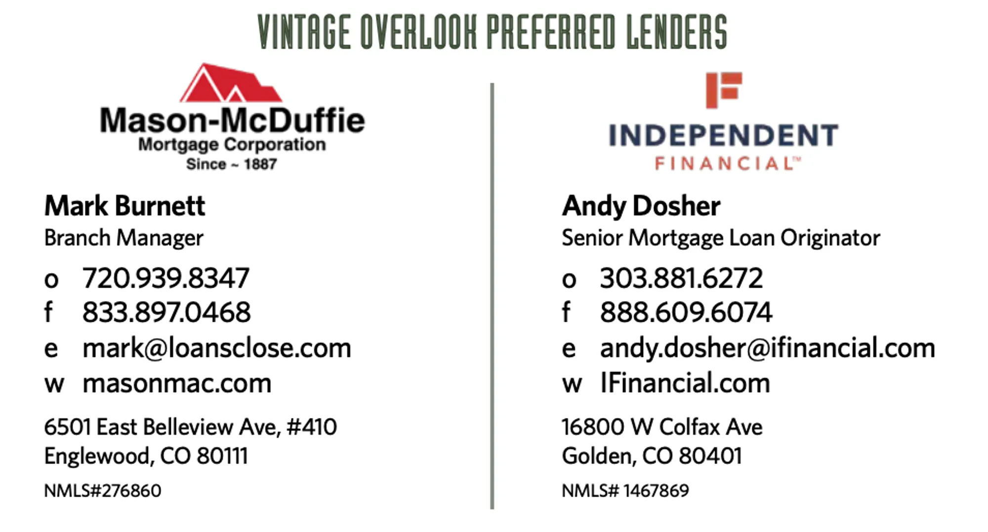 For more financial help, please ask one of our approved lenders working with Vintage Overlook in Colorado.